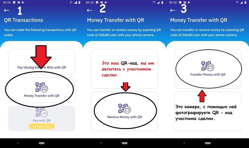 Заходим в MY WALLET // QR Transactions далее кликаем по Money Transfer with QR Далее просто фотографируем QR-код участника сделки, отправляем нужную сумму, и заполняем все поля. Поздравляю вас я думаю у вас всё получилось =))) Я думаю информация была полезна. Скачать раннюю версию OlduBil где доступен перевод по QR коду: Скачать