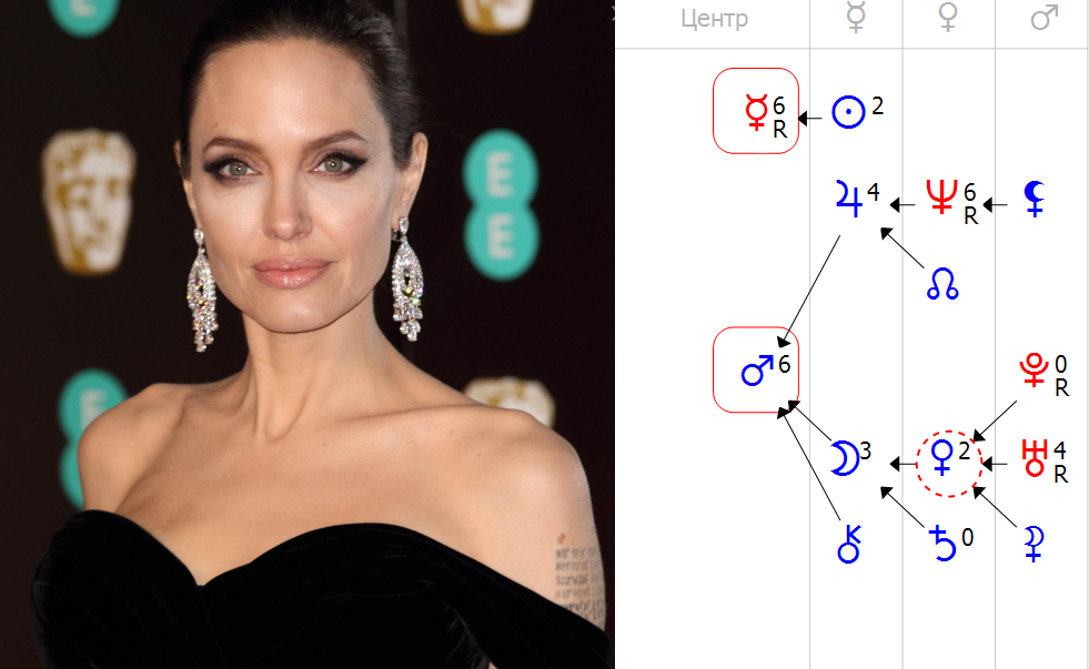 Анджелине Джоли в этом году исполнилось 48 лет. Женщина Сознания 4 – кошка, которая гуляет сама по себе, женщина загадка. Что творится у нее в голове – знает только она сама. Итак, почему не складывается личная жизнь у Анджелины Джоли? У Джоли в одном из активных центров стоит Марс. Такое положение дает женщинам сложности во взаимоотношениях с мужчинами. Они просто ее боятся. Здесь подсознательно может быть установка: «Я в борьбе с мужчинами». Такие женщины могут вступать в ссоры, из ничего затевать скандал, придираться, отпускать колкости, прожигать взглядом. Анджелина по Миссии 5, что может указывать на эмоциональное насилие и домашний терроризм с ее стороны. А знаете еще одну даму с таким же Сознанием и Миссией? Эмбер Херд. Но вернемся к Джоли. Ретро Нептун на 2й орбите может склонять к жертвенной любви. Ретро Плутон на 3й орбите указывает на проблемы с мужчинами. Ретро Уран также на 3й орбите указывает на хаос в жизни от мужчин и в дополнении в связке с Венерой – это еще один показ
