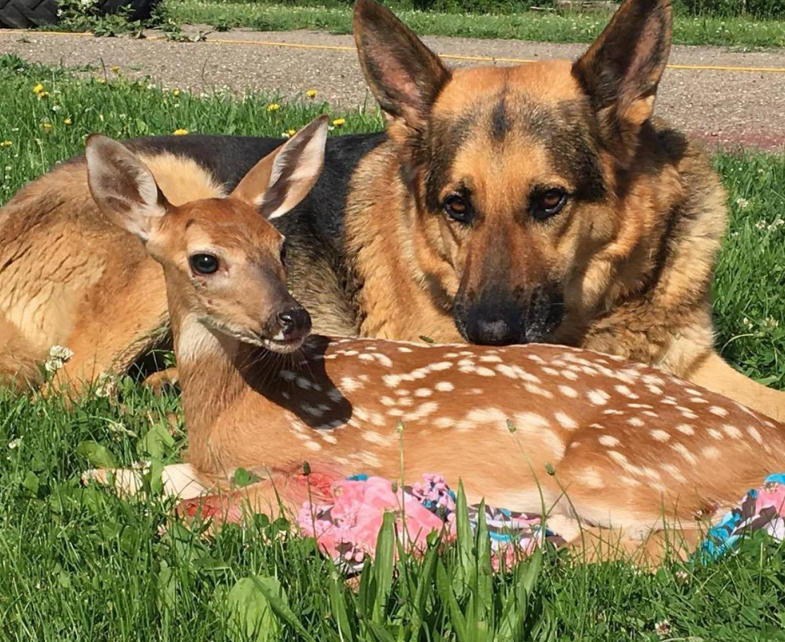 Немецкая овчарка помогает заботиться о спасенных оленях: фото добродушного пса