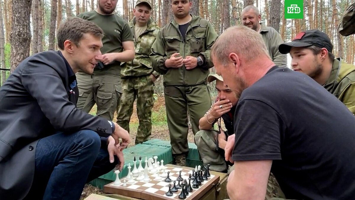 [ Смотреть видео на сайте НТВ ] Знаменитый гроссмейстер, вице-чемпион мира Сергей Карякин посетил зону спецоперации и провел мастер-класс для военнослужащих. «Отказавшись играть на Кубке мира по шахматам без российского флага, гроссмейстер Сергей Карякин приехал в зону СВО играть с теми, кто сражается под этим флагом», — говорится в сообщении пресс-службы Министерства обороны РФ. Как отмечается, заслуженный мастер спорта России по шахматам сыграл с российскими бойцами несколько партий, поинтересовался их жизнью и бытом. Вместе с гроссмейстером на передовую также отправились артисты Ансамбля песни и пляски ЦВО, которые исполнили множество музыкальных номеров. Сергей Карякин — всемирно известный шахматист, вице-чемпион мира и самый молодой гроссмейстер в истории. В прошлом году он вручил технику и амуницию 117-му стрелковому полку Народной милиции ДНР. [ Смотреть видео на сайте НТВ ]