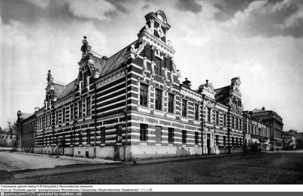 На углу Леонтьевского переулка и Шведского тупика стоит здание школы в сталинском стиле, и только немногие знают, что собой представляла эта постройка 100 лет назад. Она строилась в 1890-е годы по проекту Дмитрия Чичагова. Это здание мужского училища имени Сергея Алексеевича Капцова, построенное на его средства. И это было самое красивое и удивительное здание переулка. По стилю здание напоминало североевропейскую архитектуру, от ренессанса до барокко. В 17-19 веках тут находилось Шведское подворье: в названии Шведского тупика сохраняется память о нём. А вот о здании Капцовской гимназии ничего не напоминает сейчас в облике перестроенного здания Увы, здание было надстроено и перестроено до неузнаваемости в 1952 году. Леонтьевский переулок потерял свою жемчужину. Сейчас в здании Школа имени Капцовых В рубрике "Утраченное: примечательные строения Москвы" мы писали о других постройках, которые были изменены до неузнаваемости: Дом на Тверском бульваре рядом с ТАСС - посмотрите на эту красот