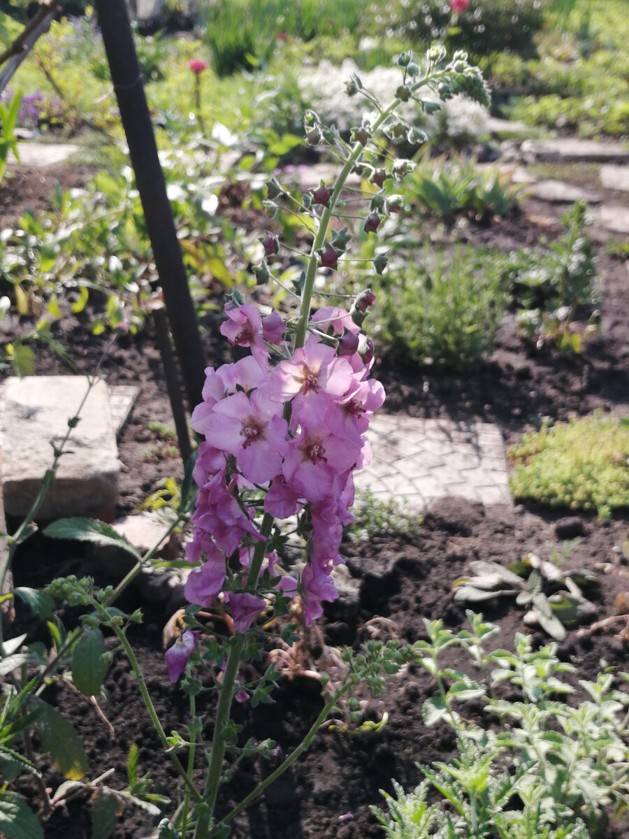 "задалось" - чуть не с первого июня у нас то +35, а то и +38. Такое ощущение, что нормальной погоды этой весной не было вообще - то холода, в которые все пыталось вымерзнуть, то иссушающий ветер, теперь вот лето зашло сразу с козырей. Но нам, на самом деле, еще грех жаловаться - у нас хотя бы пара-тройка дождей приключилась. И то хлеб. Растения еще не успели умучиться от жары и радостно кинулись кто в рост, кто в цвет. В прошлом году я сеяла коровяк. Не тот, который желтый дикарь, а тот, который продают под название вербаскум) Он двулетник, что будет за цветение я себе совершенно не представляла. А получилось неплохо. А главное, цветет он довольно рано, и, если подсадить его куда нужно, вполне может украсить поздно просыпающиеся цветники. Перезимовал, кстати, совершенно без проблем. Надо поискать семена и подсеять его с тем, чтобы на будущий год цветение тоже было. Тут проявилось что-то местно-ковыльное, притащенное в прошлом году с поля: Этот цветник пока только наполняется, больша