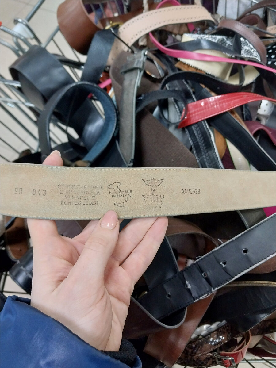 Я снова посетила секонд, хочу поделиться своими находками. В предыдущей статье писала, что рядом с домом есть 3 магазина, куда я периодически заглядываю: несетевой маленький и 2 крупных сетевых: ВоВа и Мегахенд. Везде раз на раз не приходится, в каждом попадаются?классные вещи. Я беру обычно известные бренды, которые в обычных магазинах стоят оопаздо дороже, что-то себе и ребёнку, что-то для продажи (если вижу, что быстро купят), некоторые вещи для родственников. Первое, что хочу показать, это крутой итальянский ремень. Практически новый, заломов нет, видно, что надет считанные разы. Кожа натуральная. Ручная работа, есть фирменное клеймо VMP. Я поискал в интернете, такая марка есть и сейчас. Удалось найти именно этот ремень. Мне он обошёлся в 80 рублей со скидкой 20% в Вове. Его не покупали из-за необычной особенности - отсутствовала пряжка. Оказалось, что их продают в таком виде, пряжки покупаются отдельно - самые разные, дизайнерские и обычные. Кожа, сделанная под змею выглядит