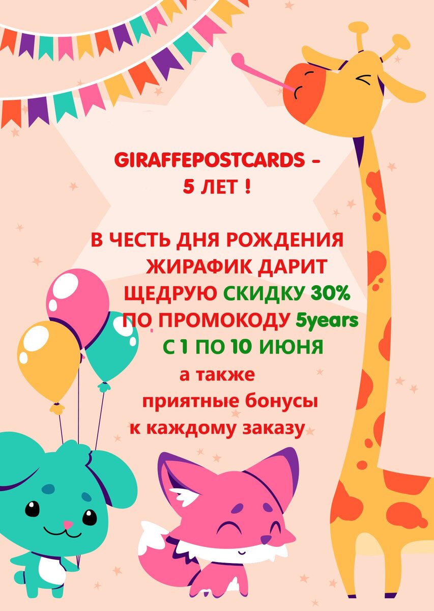 Чтобы получить праздничную скидку 30 % и принять участие в розыгрыше нужно оформить заказ на сайте https://giraffepostcards.ru/ до 10 июня и ввести промокод 5years в белое окошко при оформлении заказа. Также действует бесплатная доставка для заказов от 1200 рублей с учетом скидки! Хорошего летнего настроения! Поделитесь промокодом с друзьями-посткроссерами :*)