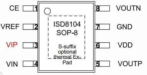 Продолжаем цикл «Интересные микросхемы». Сегодня я хочу познакомить вас с суперэкономичным низковольтным прибором ISD8104. Общая информация Микросхема ISD8104 представляет собой одноканальный аналоговый усилитель звуковой частоты с дифференциальным входом класса АВ. Коэффициент усиления прибора по умолчанию составляет 20дБ, но может быть изменен в меньшую сторону при помощи внешних элементов. При питании 5 В усилитель развивает мощность 2 Вт на нагрузку сопротивлением 4 Ом. Особенностью устройства является низкий (не более 1 мкА) ток потребления в режиме ожидания и система подавления щелчков. Минимальное напряжение питания – 2 В, что позволяет его использовать в устройствах, питающихся от одного литиевого аккумулятора. Микросхема имеет защиту от перегрузки по выходу. На заметку. При необходимости микросхема может быть сконфигурирована для работы в режиме однополярного (недифференциального) входа. Назначение выводов и характеристики Микросхема выпускается в корпусе SOP и имеет 8 выводо