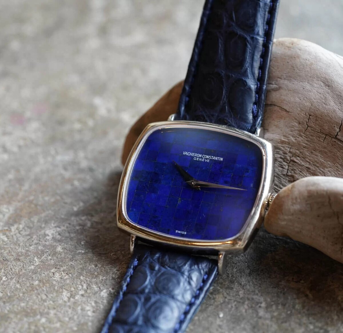 Наиболее интересной и выделяющейся особенностью, же, этих Vacheron Constantin является совсем не корпус, но циферблат. Что особенного? Невероятной глубины натуральный синий цвет достигнут здесь не с помощью металла или лака, а с помощью мозаики камня лазурита, который квадратами был вырезан и нанесён на циферблат вручную.