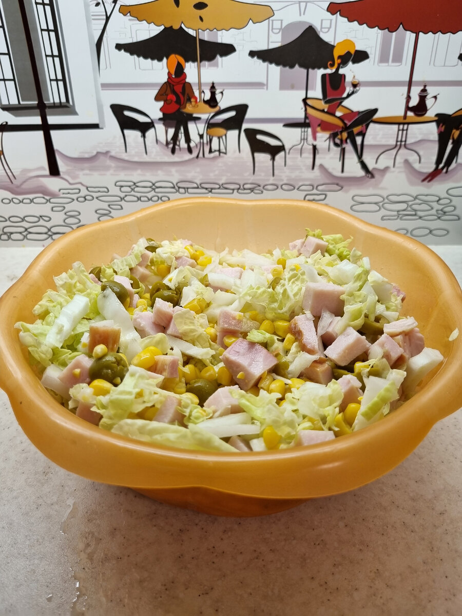 Ингредиенты: ✅️ Ветчина 300 гр ✅️ Пекинская капуста 5-6 листов ✅️ Кукуруза 170 гр ✅️ Ананасы кусочками 300 гр ✅️ Оливки 300 гр ✅️ Майонез и соль по вкусу Шинкуем пекинскую капусту. Нарезаем ветчину кубиками. Добавляем кукурузу. Нарезаем оливки. Добаваляем ананасы. Всё перемешиваем и заправляем майонезом по вкусу.
