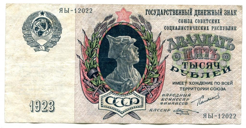 Добрый день, меня зовут Лев. Рад приветствовать Вас на своем канале. Сегодня хочу рассказать вам о трех редких банкнотах Советского Союза, выпущенных в 1923 году. Редкие советские банкноты 1923 года являются уникальными историческими объектами, которые отражают экономические и политические изменения, происходившие в первые годы Советской России. Любой коллекционер может обрести в этих банкнотах не только красивые и интересные объекты, но и уникальную возможность углубиться в историю нашей страны. Купюра 25000 рублей 1923 год. СССР Купюра 25000 рублей 1923 года в СССР была одной из самых крупных банкнот своего времени. Она была выпущена в период гражданской войны и гиперинфляции в стране, когда денежная система находилась в кризисе. На лицевой стороне купюры изображен портрет Красноармейца, а на обратной - изображение Кремля и звезды. Купюра была напечатана на высококачественной бумаге и имела защитные элементы, такие как водяные знаки и металлическая нить. Сегодня купюра 25000 рублей