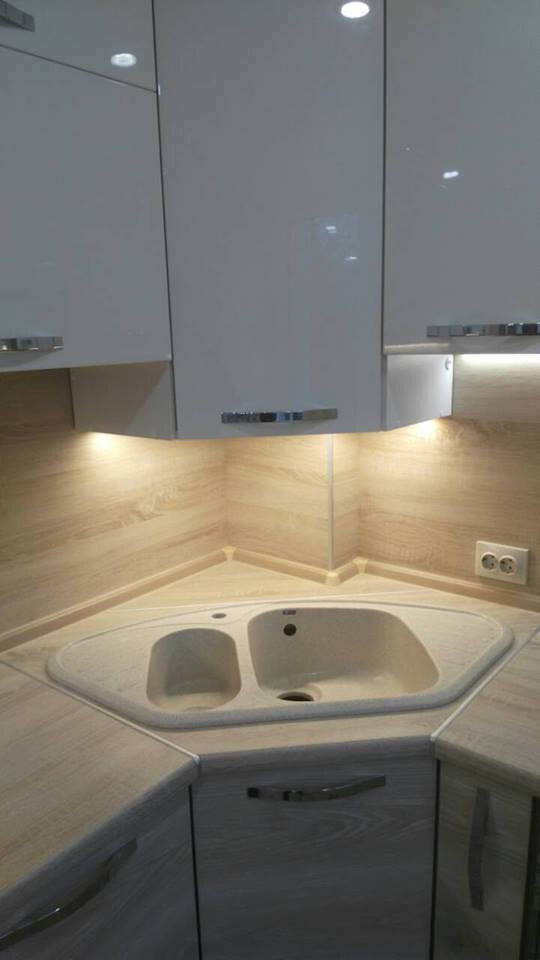 Фасады: верх: MDF крашеный (глянец); низ - пластик Melatone в кромке ПВХ.