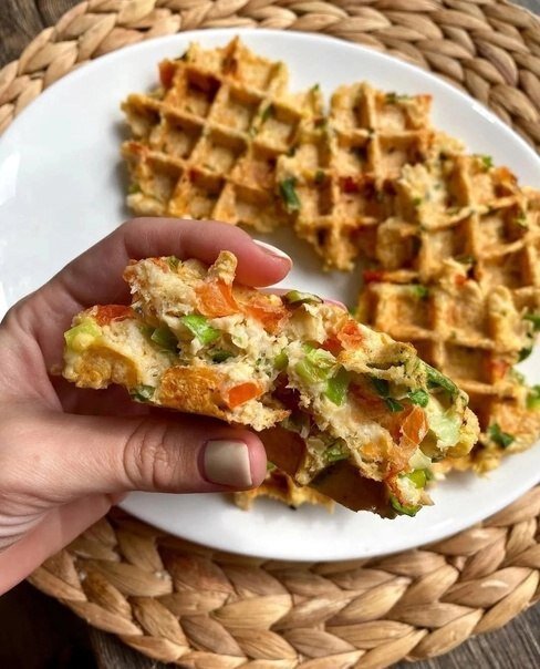 Ингредиенты: ️ Способ приготовления: Курицу отварить и очень мелко порезать. А также режем лук, помидор, а сыр на терке. Хлопья смолоть в муку . Смешиваем все ингредиенты, получается густое тесто . Выпекаем вафли 3-4 минутки. Если нет вафельницы, можно сделать оладьи )Приятного аппетита !
