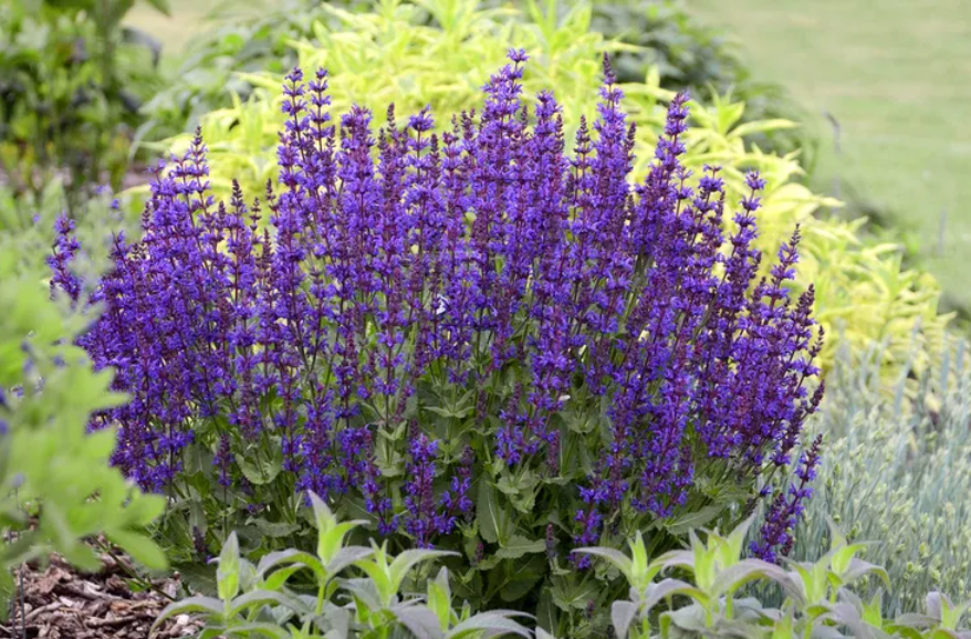 Шалфей русский, одно из самых стойких к засухе многолетних растений, отличается ароматной серебристой листвой и шлейфами фиолетово-пурпурных цветов. Более высокие сорта отлично подходят для задней части бордюра. Он не только устойчив к жаре и засухе, но и олени, кролики и большинство других вредителей избегают его.