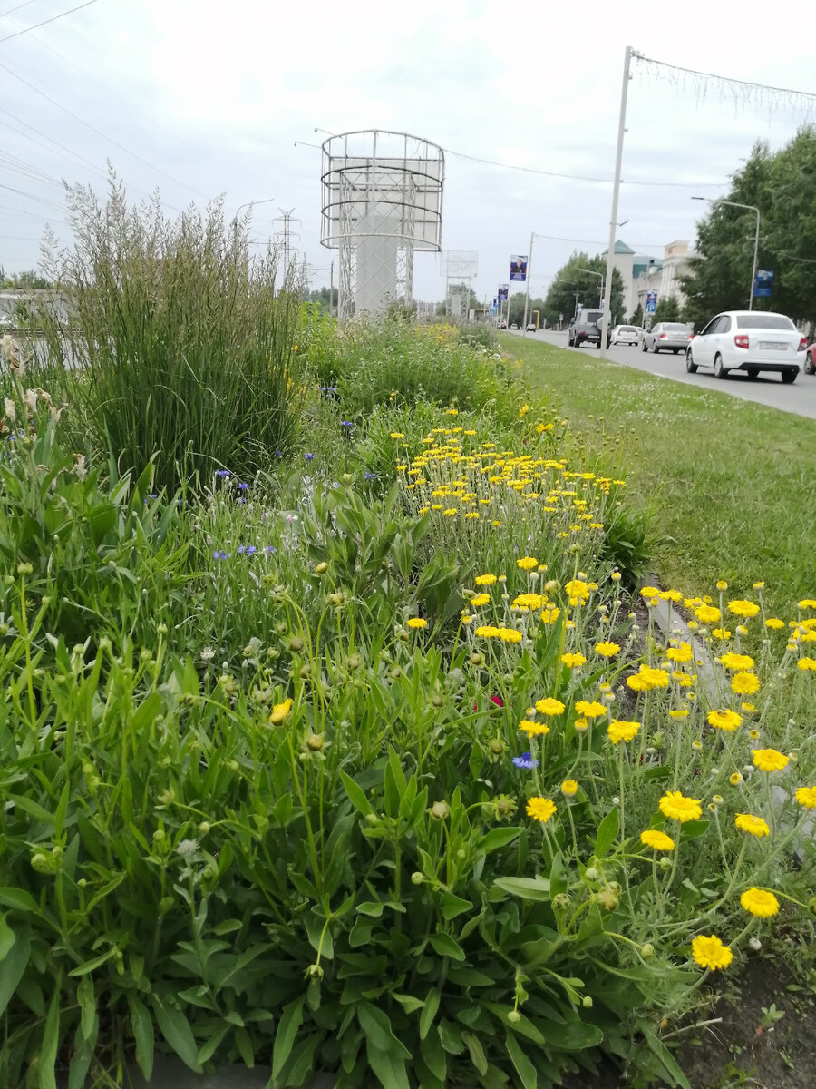 Поскольку вчера у меня была велопрогулка, меня занесло в ту часть города, где разбит миксбордер, о котором я уже писала. Интересно было глянуть, что там делается в начале лета. Оказалось, все отлично. Даже та часть, которая была перекопана в прошлом году, уже восстановлена и засажена растениями. Да, они еще не очень разрослись, но лето впереди долгое, успеют. Итак, встречает нас сочетание желтого с голубым и зеленым. Интересно, что антемис (пупавка) уже цветет. У меня в саду за городом эти растения только набрали цвет. Неплохой подбор культур для городского цветника малого ухода, я считаю - и антемис, и васильки пересеваются отлично, а вейники практически не требуют никакого ухода. Кстати, растения я определила не все. Что такое это желтое на переднем плане, я не знаю. Смотрится, кстати, отлично. Несмотря на то, что основное цветение явно еще впереди. Вербейник тоже пришелся ко двору. Дальше появляются вкрапления шалфея. Цветение ирисов я пропустила, а многочисленные разноцветные т