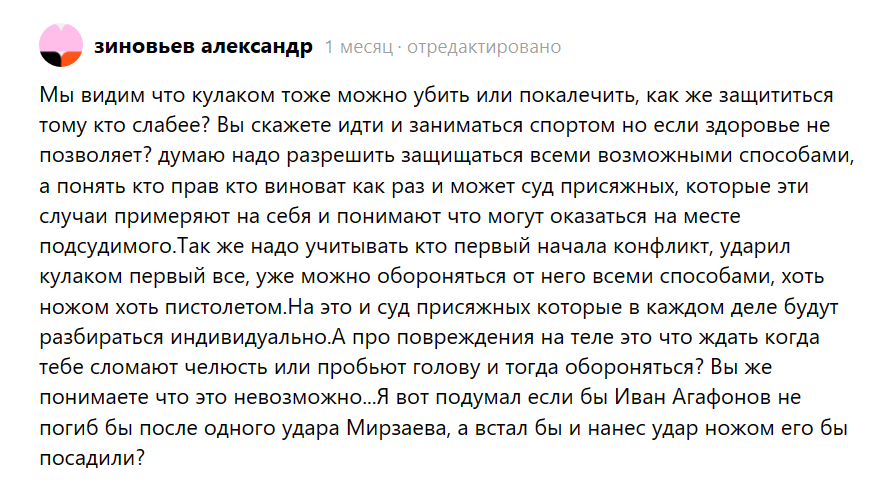 Продолжаю полемику на моем канале среди тех, кто отстаивает мнение, что можно и нужно защищаться любым способом, а нож применять необходимо тогда, когда, кажется, что есть опасность. Именно так пишут многие и многие комментаторы. Самое популярное мнение я приведу в этом скриншоте. Суть мнения, что нет никаких ограничений, если вдруг тебе показалось, что тебе грозит опасность. Именно это и есть самое слабое место данной позиции. Человек не может оценивать ситуацию верно, потому что он подвержен эмоциям, глупости и попросту безграмотен в правовом плане. И вот вам пример того, как человек посчитал, что может защищать себя даже очень серьезным ножом. Конфликт же, а почему не ударить?! - 9 июня около 14.30 на остановке «Мир» в Ворошиловском районе Волгограда при посадке в рейсовый автобус между двумя мужчинами возник конфликт, переросший в драку. В результате один из мужчин ударил ножом 57-летнего пассажира автобуса, нанес удар ножом в спину. С места преступления злоумышленник скрылся, позж