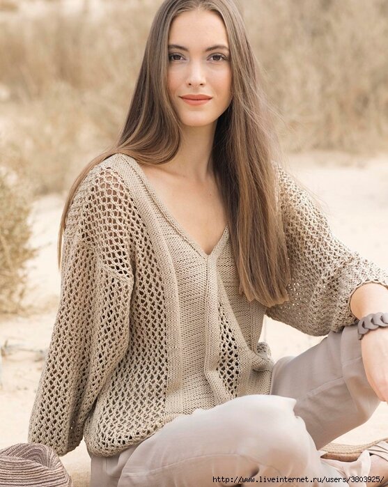РАЗМЕРЫ 38/40 (42/44) 46/48 ВАМ ПОТРЕБУЕТСЯ Пряжа (75% хлопка, 25% вискозы; 125 м/50 г) — 400 (450) 500 г бежевой; спицы №3,5. УЗОРЫ И СХЕМЫ АЖУРНЫЙ УЗОР Вязать согл. схеме. На ней даны лицевые ряды. В изнаночных рядах все петли и накиды провязывать изнаночными. При нечетном числе петель начать с петли перед раппортом, раппорт постоянно повторять, закончить петлями после раппорта и 1 кромочной. При четном числе петель постоянно повторять раппорт. Постоянно повторять 1—4-й ряды. ЛИЦЕВАЯ ГЛАДЬ Лицевые ряды — лицевые петли, изнаночные ряды — изнаночные петли. ИЗНАНОЧНАЯ ГЛАДЬ Лицевые ряды — изнаночные петли, изнаночные ряды — лицевые петли. ПЛОТНОСТЬ ВЯЗАНИЯ 16 п. х 27 р. = 10 x 10 см, связано ажурным узором; 21 п. х 27 р. = 10 x 10 см, связано лицевой и изнаночной гладью. ВЫКРОЙКА ВЫПОЛНЕНИЕ РАБОТЫ СПИНКА Продолжить работу следующим образом: кромочная, 19 (23) 27 п. ажурным узором, 6 п. лицевой гладью, 13 п. изнаночной гладью, 6 п. лицевой гладью, 6 п. ажурным узором, 6