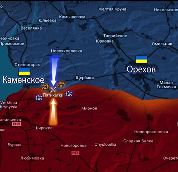 Сегодня идёт ожесточенный бой в Васильевском районе , враг при помощи дополнительных сил штурмует Пятихатки. При поддержке танков и БМП пехота ВСУ несмотря на потери смогла зайти на окраину села, наступая волнами. На западной окраине села ВСУ заняли несколько первых домов. Бойцы 19 дивизии активно контратакуют, уже несколько раз они отбрасывали противника, но новая волна наступления снова смогла зайти на западную окраину Пятихаток. Наши продолжают накрывать врага гаубицами, миномётами , РСЗО и Солнцепёками. Работают танки, работает авиация. Наша пехота , то обороняется, то переходит в контратаку.