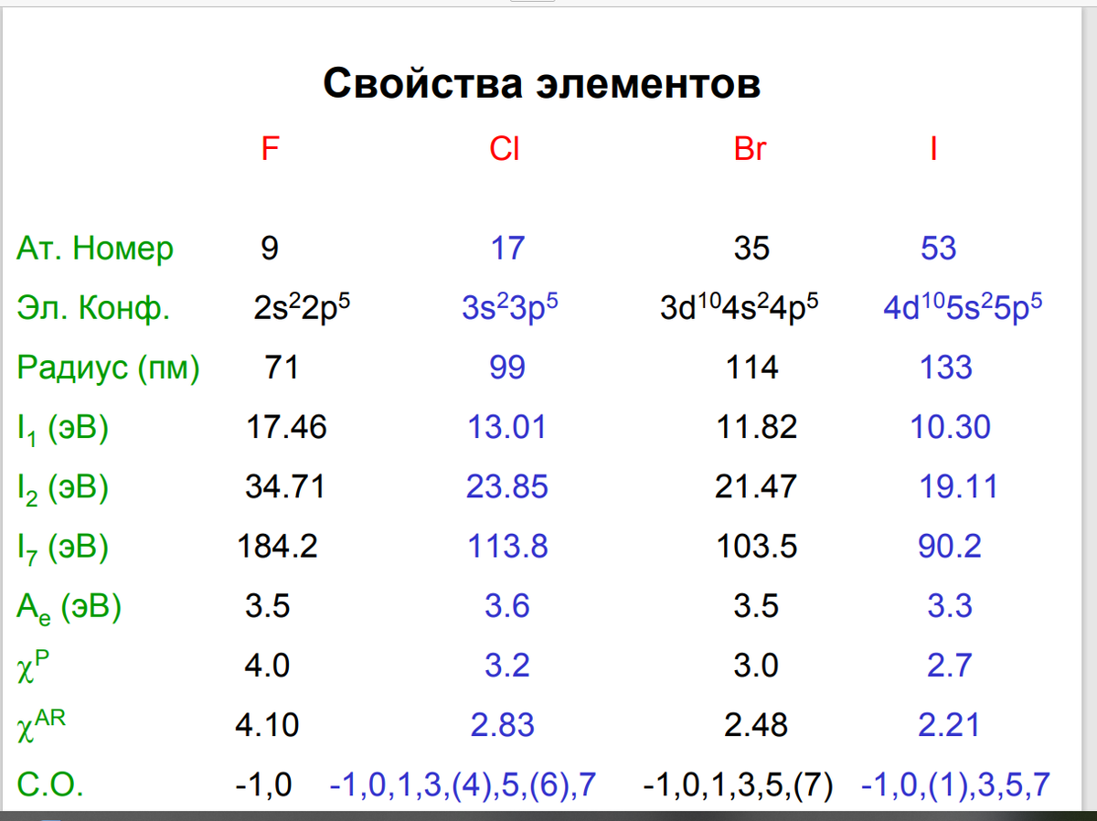 2.1 Галогены. Степени окисления. Диспропорционирование галогенов. Сопоставление окислительных способностей. Галогеноводороды и галогеноводородные кислоты. Особенности HF. Галогениды металлов и неметаллов, их взаимодействие с водой. Оксиды галогенов.