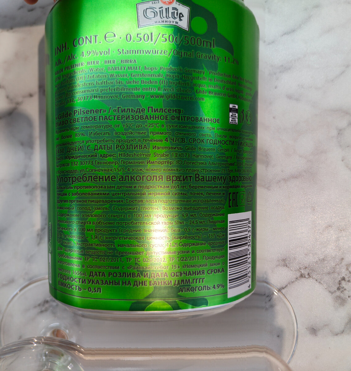 Подписывайся на канал, что бы не пропустить новые публикации каждый день! Обзоры на пиво, новости из мира пива и многое другое здесь! Изготовитель: Gilde Brauerei GmbH, город Ганновер, Германия. Состав: Вода подготовленная (исправленная), ячменный солод, хмель. Плотность 11,2%, крепость 4,9% Тип брожения: Лагер (Lager) Сорт: Пилзнер (Pilsner) Цена: +-90р Пиво куплено в сети магазинов "Магнит", объем 0,5 литра. Взял по "скидке" за 70 рублей. Описание: Наше флагманское пиво Gilde Pilsener - это традиционный немецкий лагер золотистого цвета с идеально сбалансированным вкусом. Наша уникальная смесь хмеля придает пиву нежный аромат, в то время как солод обеспечивает отчетливое хрустящее послевкусие. Дегустация: Пенная шапка поднимается пышная, белого цвета, но не особо стойкая, шустро опадает и оставляет пиво лысым. Карбонизация довольно высокая. Цвет золотистый, прозрачное пиво. В аромате солод, зерно, хмеля мало совсем цветочно - лугового. Во вкусе сладковатый солод, немного цветочков и