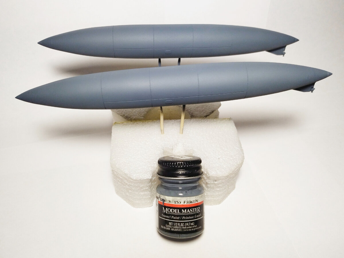 Продолжается постройка F-15E Тамия в 32 масштабе. Подвесные топливные баки загрунтованы грунтами Тамия и 128 и окрашены легендарной краской фирмы Testors. Почему краска Testors легендарная? Поэтому, что в качестве используемой моделистами в России была очень давно, а качество этой краски одно из лучших в мире моделизма. Баночке краски Testors, цвет FS 36176, как минимум лет 10. Но время не властно над качественным продуктом. В начале разбавил краску растворителем для эмалей Тамия производства Моделист. Если растворитель Моделист для красок Sangyo Gunze на летучем растворителе полный аналог оригинального, то растворитель Моделист для эмалей Тамия отличается от оригинального. Основное отличие это более длительное испарение в результате более долгое высыхание краски. В принципе в этом нет ничего критичного, однако мне удобнее быстрое высыхание краски. Зная совершенно фантастическую восприимчивость эмалей Testors к разным растворителям решил развести эмаль Testors растворителем Sa