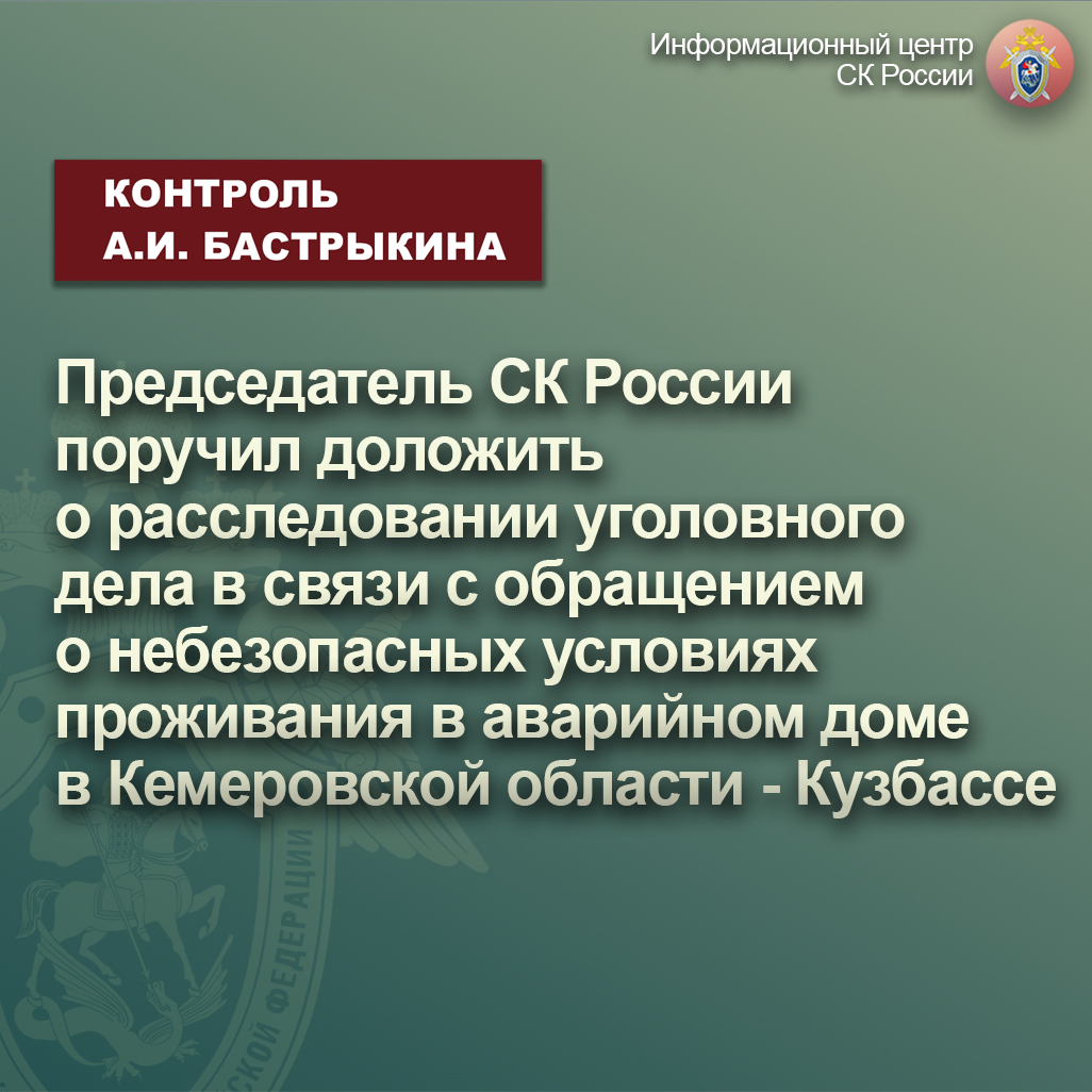 К главе СК России А.И. Бастрыкину в его Приемную «ВКонтакте» обратилась жительница Кемеровской области – Кузбасса. Вместе с матерью-инвалидом она проживает в многоквартирном доме, 1962 года постройки. В ноябре 2021 года здание признано аварийным и подлежащим сносу: в доме обрушились кровля и потолочные перекрытия. Несмотря на соответствующее решение суда, до настоящего времени семья вынуждена проживать в небезопасных условиях, а местная администрация не обеспечила их благоустроенным жильем. В СУ СК России по Кемеровской области – Кузбассу расследуется уголовное дело. Председатель Следственного комитета Российской Федерации Александр Иванович Бастрыкин поручил руководителю СУ СК России по Кемеровской области – Кузбассу Александру Сергеевичу Безукладникову доложить о ходе и результатах расследования уголовного дела. #СледственныйКомитет #СКРоссии #СКР #ИЦСКР #Информационныйцентр #АлександрБастрыкин #ПредседательСКР #КонтрольПредседателяСКР #КомментарийКонтроль #КемеровскаяОбласть
