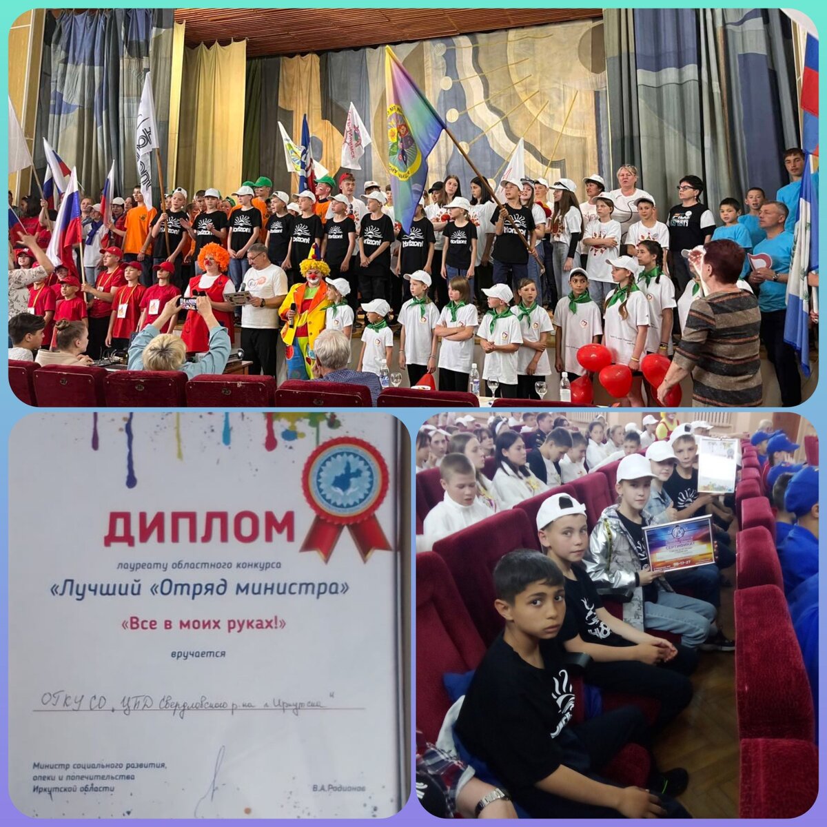 В ДОЛ «Юбилейный» в период с 5 по 25 июня 2023 года по поручению министра социального развития, опеки и попечительства Иркутской области Владимир Анатольевич Родионова организована профильная смена отдыха и оздоровления Отрядов министра. 13 июня 2023 года в рамках профильной смены прошло очень красочное и эмоциональное мероприятие – финал областного конкурса «Лучший Отряд министра – «Все в моих руках!». Наши воспитанники из Отряда министра «Horizont» стали лауреатами областного конкурса. Ребята на протяжении 2022 года и истекшего периода 2023 года реализовали добрые дела и участвовали в социально-значимых мероприятиях – это и уборка памятников, мемориалов, исследовательская работа по изучению судеб героев своего района/города, изготовление блиндажных свечей и маскировочных сеток для участников СВО, сбор и сортировка гуманитарной помощи, чествование участников ВОВ и детей войны, оказание посильной помощи гражданам пожилого возраста и инвалидам, семьям с детьми, оказавшимся в трудной жиз