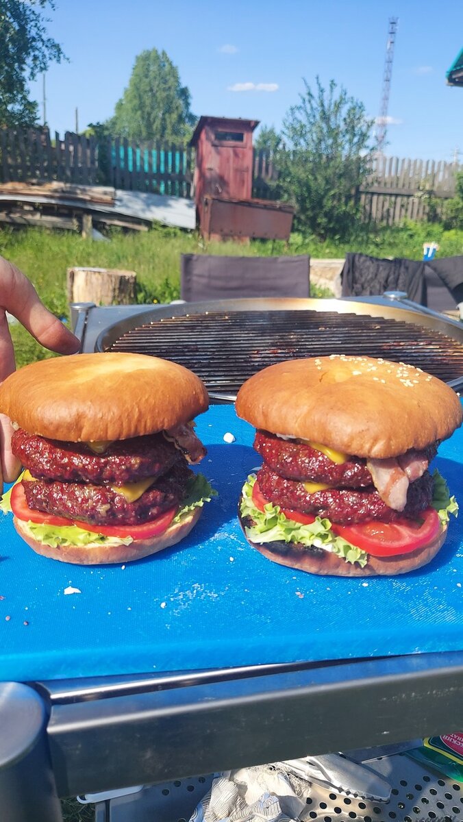 День рождения прошёл, а вкусно кушать надо всегда! Сегодня я на даче, с товарищем поваром! А это значит, что будем отрываться по полной. Новый рецепт. Сохраняйте себе и погнали готовить вот такую вкуснятищу! Для начала замесим тесто для булочек! Яйцо - 1 штука (50 грамм) Сахар - 10 грамм. Соль - 3 грамм. Дрожи - 4 грамм. Вода (тёплая) - 70 грамм. Всё это замешмваем и добавляем муки 230 грамм. Когда тесто почти готово и вы его как следует замесили, надо добавить 30 грамм сливочного масла и месить его ещё минут 10, чтобы всё масло разошлось. Получилось тесто, которое мягкое и не липнет к рукам. Накрыли плёнкой и оставили на час в теплом месте. Через час будет вот так. Режем его пополам и катаем шарики. Шарики плющим и накрываем плёнкой. Ещё полчаса и булочки готовы к выпеканию! В этот момент я затупил. Надо было посыпать кунжутом, когда я ещё их плющить. В итоге кунжут не особо то и прилип. Самое время растопить угольный гриль! Потому, что булочки выпекать будем на нем! Положили на фольг