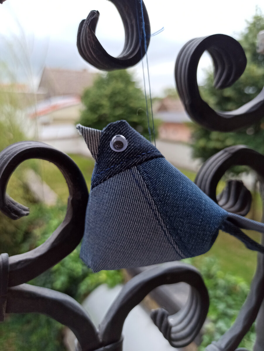 Продолжаем шитье различных изделий из джинс. Сегодня сделаем милую птичку - талисмана. Нам понадобятся три квадрата со стороной 10 см. ДЛя того, чтобы части птички зрительно отличались друг от друга, один квадрат я буду использовать лицевой стороной, второй изнаночной, более светлой. И третьей возьму с той части джинс, которая самая темная. (Помните, когда мы шили подушку, я говорила о том, что пока мы не закончили весь проект, желательно ничего не выкидывать )) Итак, на том квадрате, который станет головой, отмечаем ( и отрезаем) два треугольника со сторонами по 5 см. Два других треугольника разрезаем по диагонали. Каждая сторона птички будет собрана из таких трех треугольников. Сшиваем "тело" птички. Разглаживаем, делаем отстрочку. Далее пришиваем треугольники "голову" так как показано на картинке, также отпариваем и делаем отстрочку. Так как джинс достаточно плотный материал, то для того, чтобы голова получилась более плавной,ю советую на изнанке подрезать квадрат таким образом ка
