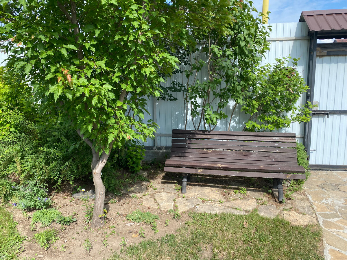Справа от калитки и ворот первая зона. На площадке, выложенной камнями, стоит скамейка, перед ней - клен татарский. За скамейкой - белая сирень и калина бульдонеж, обе в этом году очень плохо цвели.