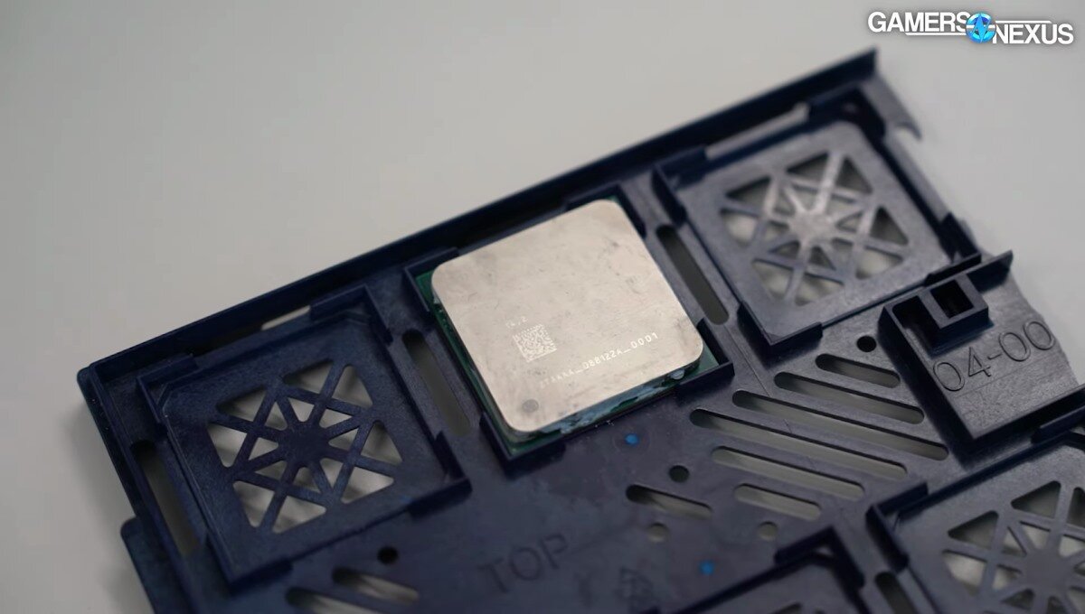 Два года назад AMD продемонстрировала свой первый игровой процессор с памятью 3D V-Cache, который имел в своём распоряжении не 8 ядер, как у вышедшего спустя несколько месяцев Ryzen 7 5800X3D, а целых 12, однако его дебют так и не состоялся: как оказалось, специалисты «красной команды» разрабатывали даже 16-ядерный CPU с дополнительным объёмом кэш-памяти, однако в широкие массы выпустить его так и не решились. Как сообщает ресурс VideoCardz, не так давно компания AMD пригласила к себе в гости представителей известного YouTube-канала Gamers Nexus, где продемонстрировала рабочие прототипы игровых процессоров Ryzen 9 5950X3D и Ryzen 9 5900X3D — 16-ядерная модель получила в своё распоряжение целых 192 Мбайт кэш-памяти третьего уровня и функционировала на частотах 3.5/4.1 ГГц в базовом/максимальном режимах, в то время как 12-ядерный CPU характеризовался частотной формулой 3.5/4.4 ГГц. Источник изображений: YouTube, Gamers Nexus К сожалению, в конечном итоге от выпуска обеих моделей решили о