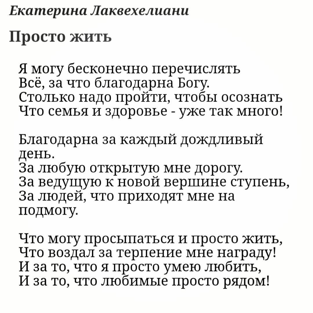 Благодарна за всё и ценю, что имею! Моя страничка на Литрес. Читайте мои книги Моя группа ВКонтакте. Заходите, читайте Больше моих стихов по ссылке https://stihi.ru/avtor/stkatrina © Copyright: Екатерина Лаквехелиани, 2023 Свидетельство о публикации №123021505908