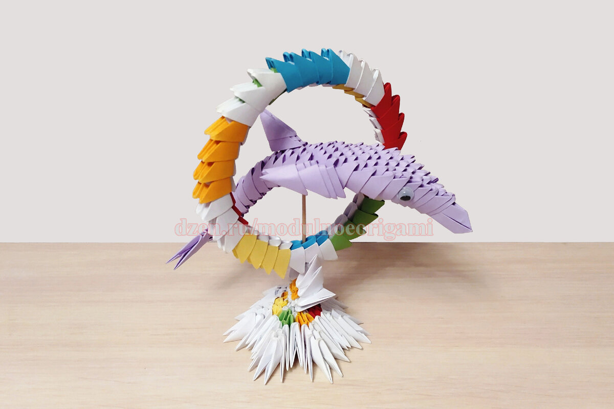 Для дельфина нам понадобится 343 модуля: 138 сиреневых, 122 белых, 23 оранжевых, 15 желтых, 15 синих, 15 зеленых, 15 красных Цвета можете взять на свое усмотрение. Как собирать модули, можно посмотреть здесь.