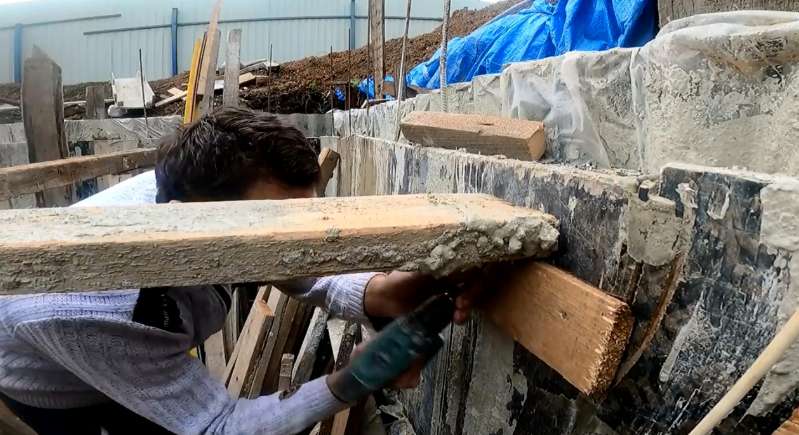 По прошествии некоторого времени с момента заливки стен подвала наконец настало время снять и демонтировать опоры. Соблюдая осторожность в процессе удаления, я планирую перепрофилировать доски для будущего использования. Чтобы создать центральный упор, я вставляю бревно и предварительно отмечаю 20 см от верха для конечной точки застывания. 10 см отметки отводится под лаги, а оставшиеся 25 см пойдут на поддон и фанеру для надежного удержания опалубки. Следуя шаблону, прикрепляю планку, подпорки и поддон, оставляя до верха всего 2,5 см свободного пространства, это толщина фанеры ДСП. Для поддержки использую доски 50х150 и старые поддоны. Поддоны никак не закреплены и просто опираются на доски, так как после застывания бетона их необходимо демонтировать. Стержни — это единственное, что крепится к вертикальной опалубке. На протяжении всего процесса мне приходилось регулировать размер внешних поддонов, чтобы они подходили должным образом. После того, как полуфинальный ящик готов, я приступа