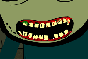 Маленькая девочка хихикает и говорит, что вороне, должно быть, тоже нравятся ложки. Шок от того, что девушка говорит с ним по-английски, а не собственным голосом Салата Фингерса (или визгами, которые издавали его куклы и / или другие живые существа), приводит Салата Фингерса к временному помешательству, галлюцинациям, слышанию визжащих, искаженных звуков и видению девушки (в комплекте с пустыми глазницами), говорящей: "Что случилось, мистер Фингерс? Тебе не нравятся мои слова изо рта? Непослушный рот!"
