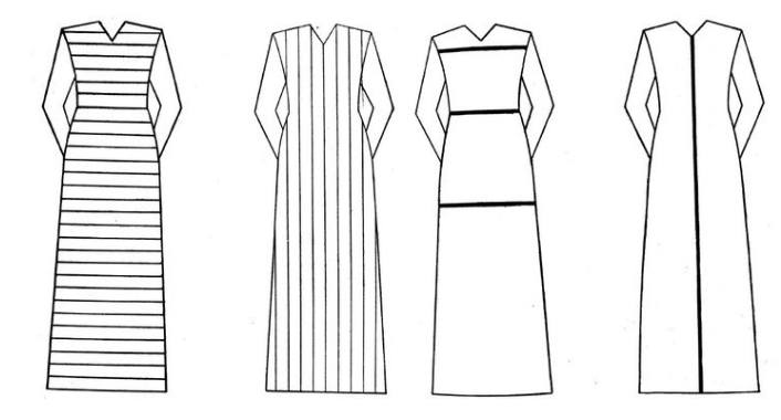Рассмотрим два прямоугольника. Прямоугольник с перекрещивающимися горизонтальными полосами кажется более высоким и широким по сравнению с прямоугольником, где полосы идут вдоль его сторон. Это явление называется "иллюзией заполненного пространства", которая заключается в том, что заполненное расстояние кажется больше, чем незаполненное. В первом прямоугольнике вертикальная сторона заполнена полосами и кажется длиннее, во втором - горизонтальная. Глаз воспринимает повторяющийся ритм и продолжает его в направлении движения. Количество полос также играет роль. Малое количество горизонтальных полос приведет к визуальному расширению прямоугольника (в то время как малое количество вертикальных полос его вытянет). Это можно проиллюстрировать на следующих фигурах: Фигура с частыми горизонтальными полосами (1) кажется более высокой и широкой, чем фигура с частыми вертикальными полосами (2). Таким образом, частые вертикальные полосы создают впечатление увеличения ширины, а горизонтальные, наобо