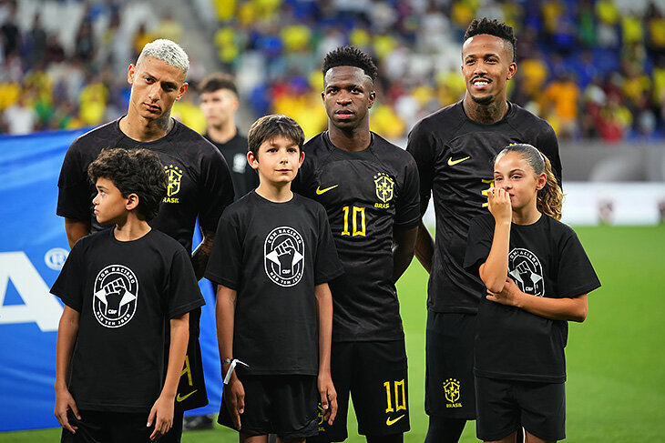 Акция против расизма. Товарищеский матч между Бразилией и Гвинеей неожиданно стал важной акцией против расизма. Бразилия впервые в истории вышла на поле в черной форме в знак борьбы с расизмом и отдельно в поддержку Винисиуса, который регулярно подвергался расизму в матчах Ла Лиги за «Реал». История из игры с «Валенсией» стала поворотной – весь мир сплотился вокруг игрока. Дети вышли в специальных футболках. Игроки встали на колено. Важное фото. Вини вышел в футболке с номером 10 – нет, Неймар пока не отдавал номер, просто травмирован. Бразилия отыграла в черном комплекте первый тайм. После перерыва – привычные цвета: желтый, синий, зеленый. Малком появился именно в знакомых цветах – дебютировал за сборную Бразилии, выйдя на замену на 82-й минуте, и заработал пенальти. Ранее Малком выступал лишь за молодежную и олимпийскую сборные. Кстати, еще дебютировал экс-игрок «Спартака» Айртон – сыграл полный матч! Винисиус реализовал пенальти и установил итоговый счет – 4:1. У Бразилии еще забил