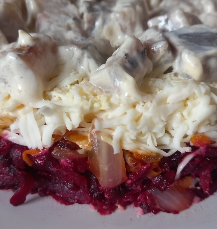 Но база - это, конечно, свекла и сельдь Свеклу можно привычно отварить. Но это занимает больше времени, чем натереть на терке и немного потушить. Именно так я предпочитаю готовить свеклу в салаты. Это и быстрее и вкуснее, жаренное всегда вкуснее вареного, и не спорьте. Слой свеклы смазываем майонезом. Пока не очень аккуратно выглядит, но это мы потом поправим Второй слой - обжаренные лук и морковь Еще немного майонеза Третий слой - плавленный сырок и еще ложка майонеза Дав вареных яйца - четвертый слой. Теперь можно салатик подравнять по краям, сформировать кружочек поаккуратнее, ну как сможем Селедку нарезаем на кусочки и смешиваем с майонезом Выкладываем селедку сверху, последним слоем, и салат готов И вкусно и сытно