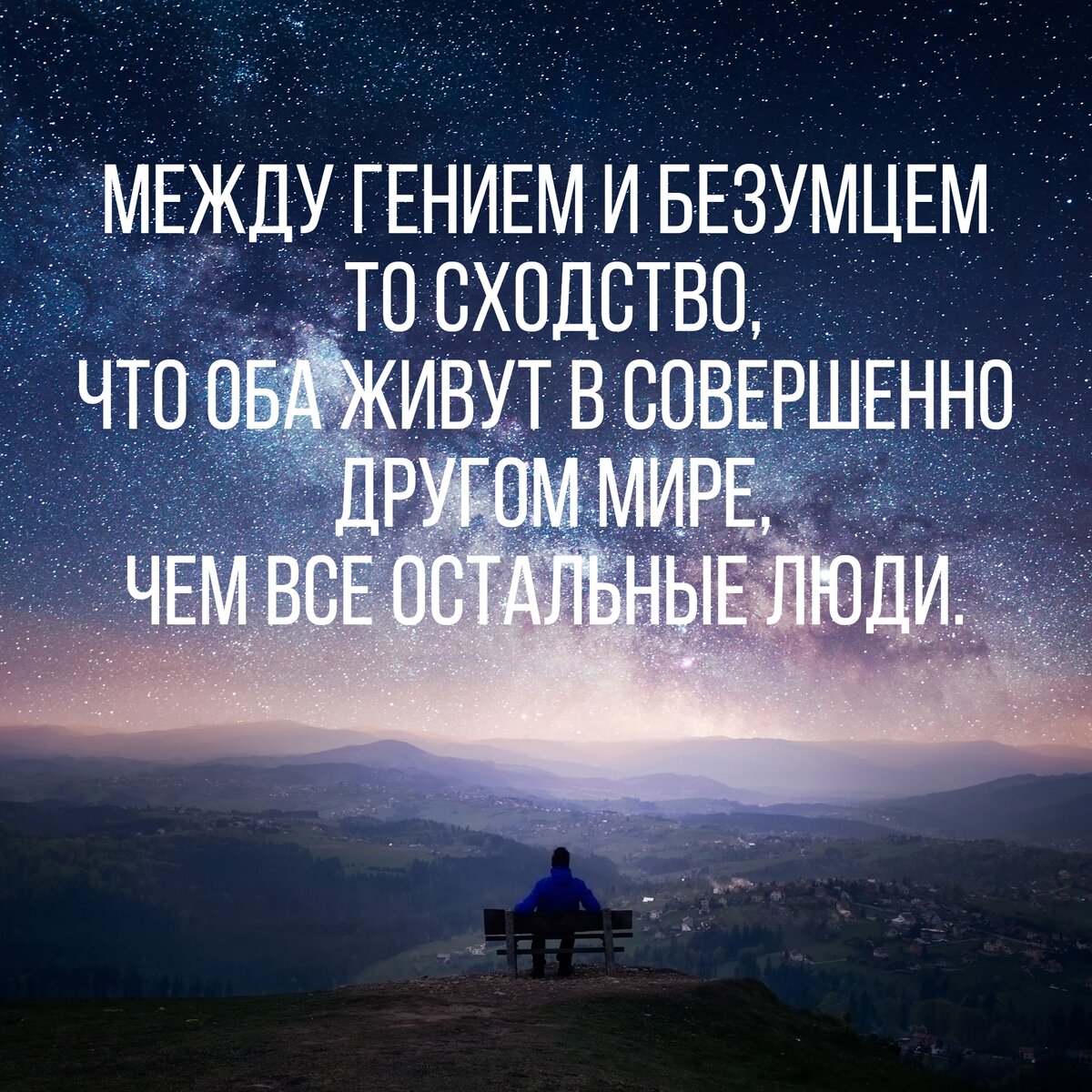 Не претендую на звание гения, не важно в какой сфере. Но могу сказать точно, что творческие люди живут в своём мире🤗 И в этом смысле цитата полностью соответствует внутреннему мироощущению😉