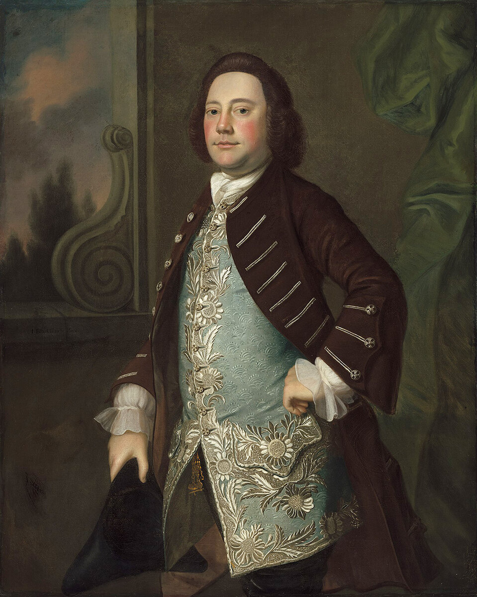 На этом красивом портрете английского художника Джозефа Блэкберна (1730–1778) джентльмен в светло-голубом жилете с серебряной вышивкой стоит в официальной позе у открытого окна, повернувшись телом влево от зрителя. Его темно-коричневое пальто и темный парик оттеняют яркий жилет. В правой руке джентльмен держит треуголку. За ним справа от нас зеленая драпировка. Хотя портрет подписан, дата его создания и история до 1956 года неизвестны, а натурщик не установлен. Отсутствие информации вызывает неразрешимые вопросы: писал ли Блэкберн этот портрет в течение десяти лет, проведенных им на Бермудских островах и в Новой Англии; во время его пребывания в Англии, либо до его прибытия на Бермудские острова в 1752 году; или после его возвращения на Британские острова лет через десять? Если бы картина была написана до 1752 года, это была бы его самая ранняя известная работа, поскольку вообще ничего не известно о Блэкберне — его рождении, обучении или ранних работах — до того, как он в том же го