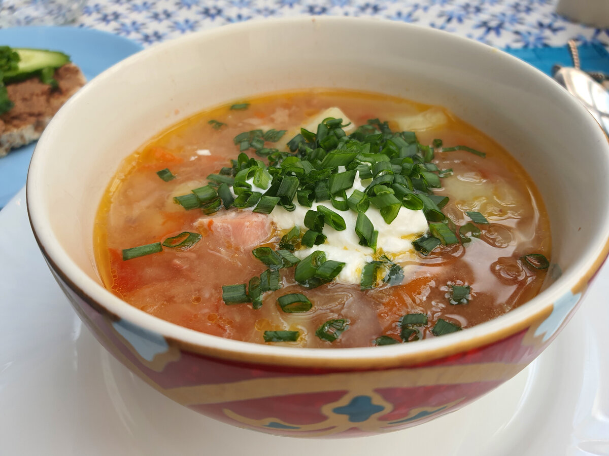 Обед со старорусскими щами и бутербродом с Бородинским хлебцем, риетом из говядины, огурцом и зелёным луком.