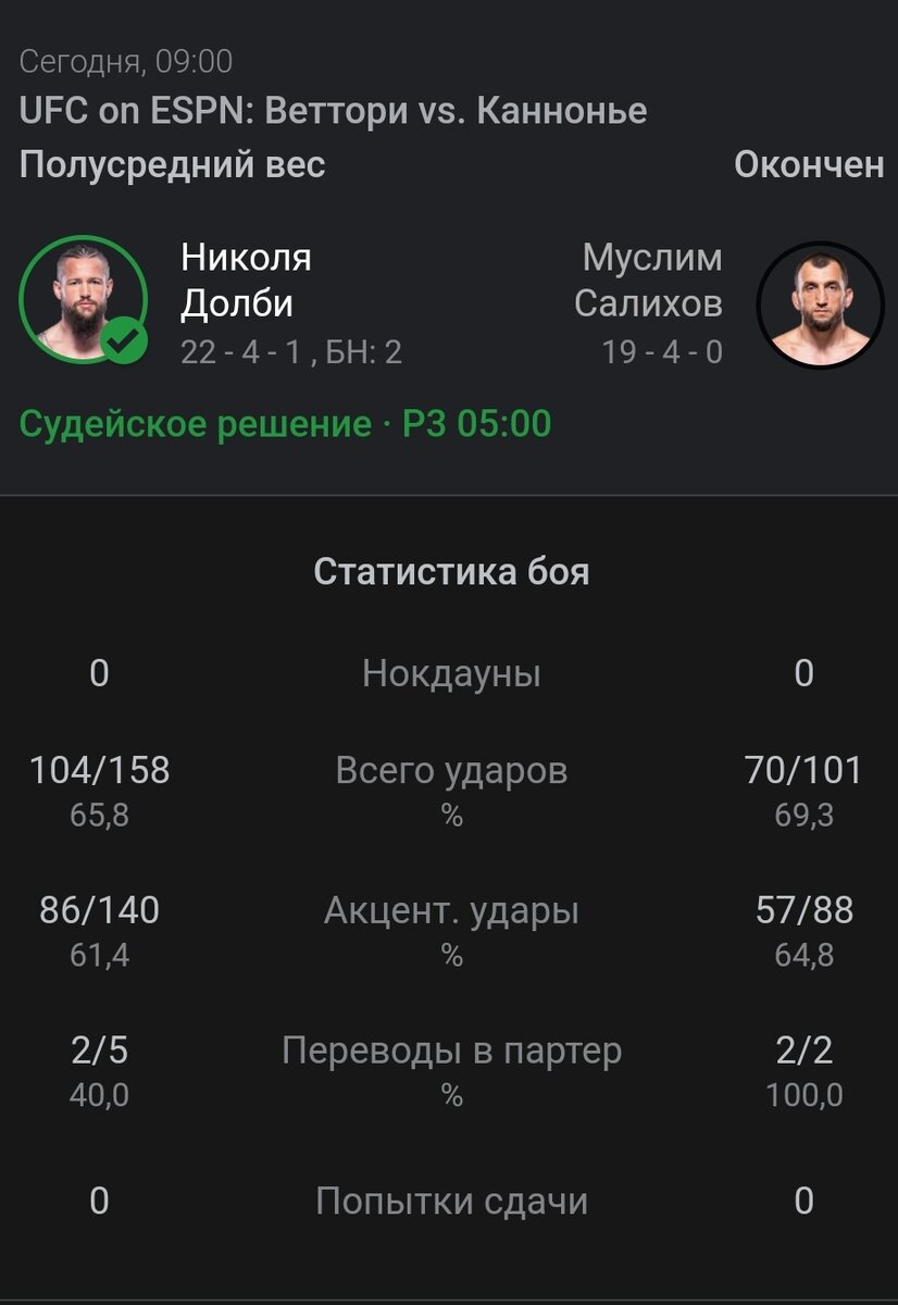 Это была сказочная мясорубка. Абсолютно точно лучший бой вечера. Если в первом раунде Веттори имел небольшое преимущество над соперником, то во втором американец просто сокрушил своего соперника. Первый раз вижу, чтобы соперник после серии таких ударов в голову продолжал терпеть, а рефери не останавливал бой, и он длился все пять раундов. Каннонье установил рекорд UFC по количеству значимых ударов в среднем весе - 241 удар. Ну, а после боя американец заявил, что у него есть только одна цель - это чемпионский пояс, как скоро он до него доберется пока не ясно.