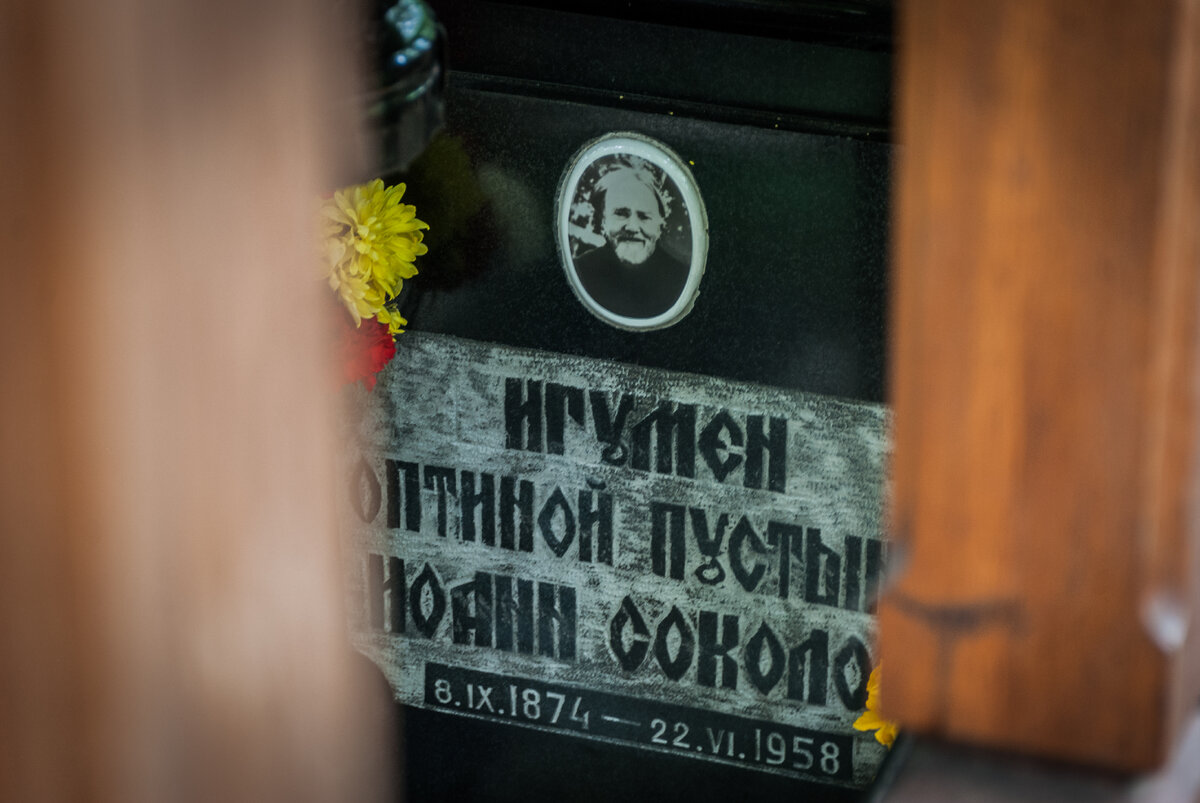 Его могилка, памятник на которой установлен также радением архимандрита Иоанна (Крестьянкина), находится напротив апсиды церкви – мраморный крест и под ним на фотографии лицо батюшки, излучающее теплый свет любви ко всем приходящим. Здесь всегда есть живые цветы.