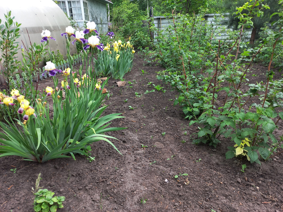 -Так мой муж называет все участки, на которых основой является голая земля. В частности, такой огород у моей мамы: И я не могу поспорить с мужем, потому что сама не в восторге от пыльной потрескавшейся земли (а она стремится именно к такому состоянию). И даже могу сказать, что вид такой земли меня раздражает. И ходить по ней, впитывать в себя сухую пыль или наматывать на сапоги после дождя шмяклую землю мне тоже не нравится. А многие садоводы предпочитают именно такое оформление. Они считают подобный вид эталоном аккуратности и прибранности. Но, есть вариант, когда голая чёрная земля действительно выглядит красиво. Это на клубах, когда цветы оттеняют чёрный цвет земли и получается такой контраст цвета. Но земля на дорожках - ой, нет. (Это моё персональное мнение, его не навязываю, но предлагаю к обсуждению). А, между прочим, именно у мамы, в этой "голодной степи" так замечательно и радостно разрастаются ирисы! Хотя, она ничего особенного для них не делает. - Посадила и забыла. Я бы даж
