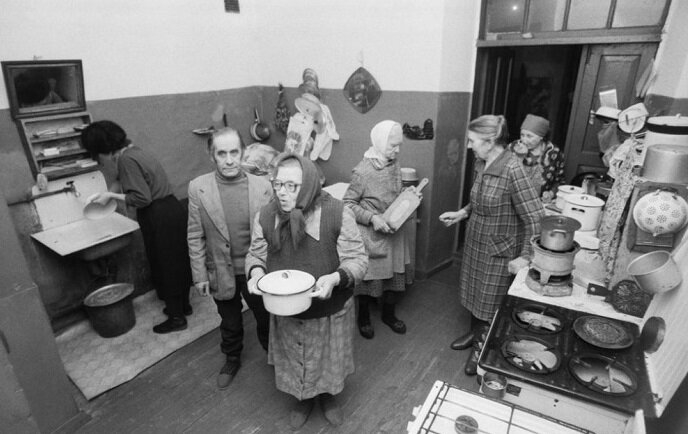 В коммунальных квартирах, которые были распространены в СССР, старше люди еще помнят такую реальность. Одна кухня, санузел и несколько комнат, в которых жили несколько семей. Десятки людей могли в одном доме ежедневно встречаться на кухне, переговариваться через стенки, делились своими делами и проблемами. Это была необычная жизнь, для многих привычная, а на сегодня уже ставшая историей. Одной из главных трудностей были любые "общие" места, такие как кухня или ванная комната. Они были очень маленькими и требовали терпения и деликатности, когда нужно было делить место со своими соседями. Чтобы уйти от этой атмосферы, некоторые люди использовали свои комнаты как приватные области, оставляя за ними закрытые двери. Семьи жили вместе, приспосабливаясь к этой жизни. Для более комфортного размещения в многих комнатах были выставлены временные перегородки, которые давали намек на «свою» часть комнаты. Вместо отдельных кроватей и больших столов, люди использовали складные кровати и убирали стол