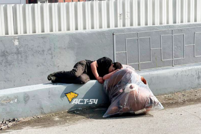 В Новосибирске мужчина уснул на бордюре с плюшевым медведем