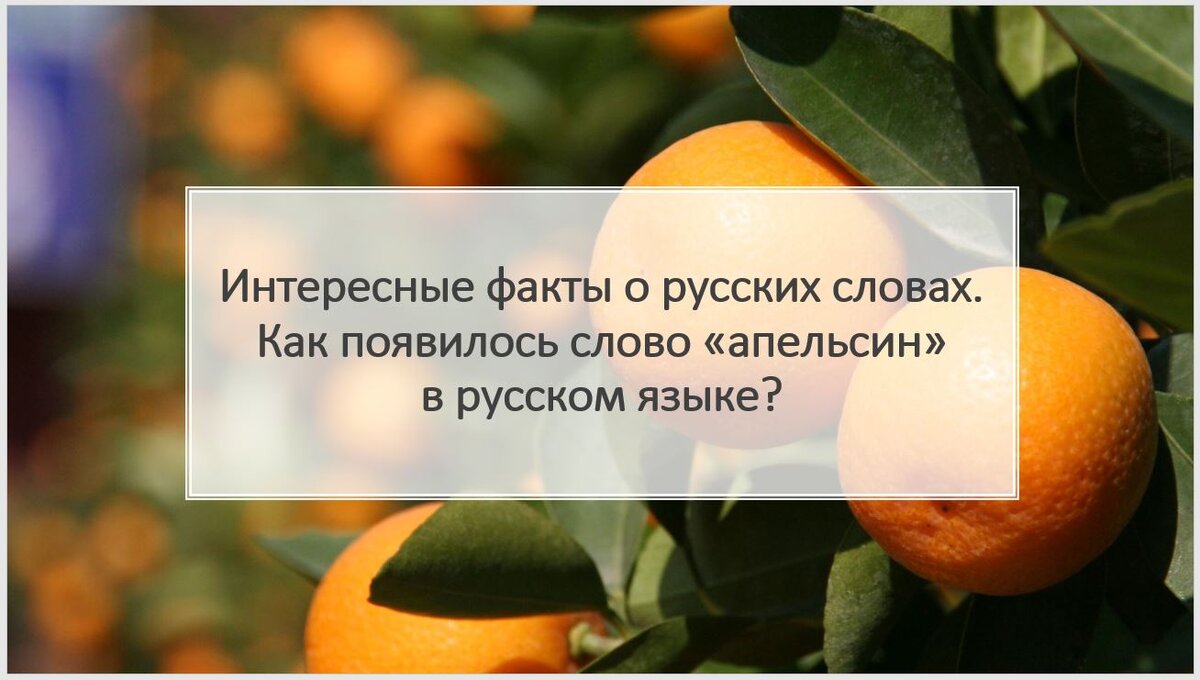 Все мы знаем, что наш язык велик и могуч. Русский язык богат, его богатство определяется огромным словарным запасом. Да, русских слов очень много. Но вы когда-нибудь задумывались, откуда и как произошло то или иное слово? Предлагаю вам почитать несколько фактов о происхождении русских слов. Итак, начнём со слова АПЕЛЬСИН. Апельсин был редкостью в древней Руси, но уже в 16 веке он стал появляться на столах московских богачей. Тогда они назывались «китайскими яблоками». А почему китайскими? Потому что их привозили из Китая. Апельсины по форме напоминали яблоко, так и прозвали их "китайскими яблоками". Позже образовалось слово "апельсин", с голландского «апполь» — это «яблоко», а «Сина» — это «Китай». Так и появилось слово "апельсин" в русском языке. Откуда взялось слово МЕДВЕДЬ? В древней Руси медведь считался опасным животным, его боялись, его уважали. Настолько боялись, что не называли его по имени «орктос», что в переводе с греческого означало «медведь». Орктос, и правда, страшн