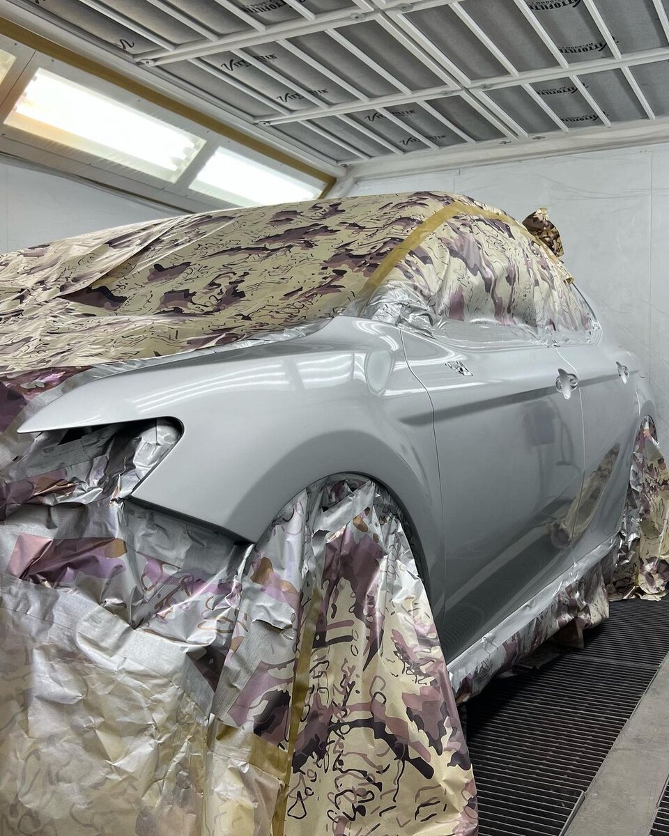 Сегодня мы расскажем о процессе полной покраски серебристой Toyota Camry. Эта процедура может занять гораздо больше времени, нежели чем локальная, но результат будет стоить затраченных усилий ☺️ Первый этап - подготовка. Машина должна быть тщательно очищена от грязи и пыли. Затем необходимо удалить все элементы, которые могут помешать покраске, такие как зеркала, ручки дверей, фары и задние фонари. Далее следует шлифовка поверхности кузова. Это необходимо для того, чтобы удалить старый слой краски и придать новой краске хорошую адгезию к поверхности. Шлифовка может быть выполнена вручную или с помощью специального оборудования. После шлифовки поверхность кузова должна быть очищена от пыли и остатков старой краски. Затем следует нанести грунтовку, которая защитит поверхность кузова от коррозии и создаст хорошую основу для новой краски. После высыхания грунтовки следует нанести несколько слоев краски. Краска должна быть равномерно распределена по поверхности кузова. Каждый слой краски д