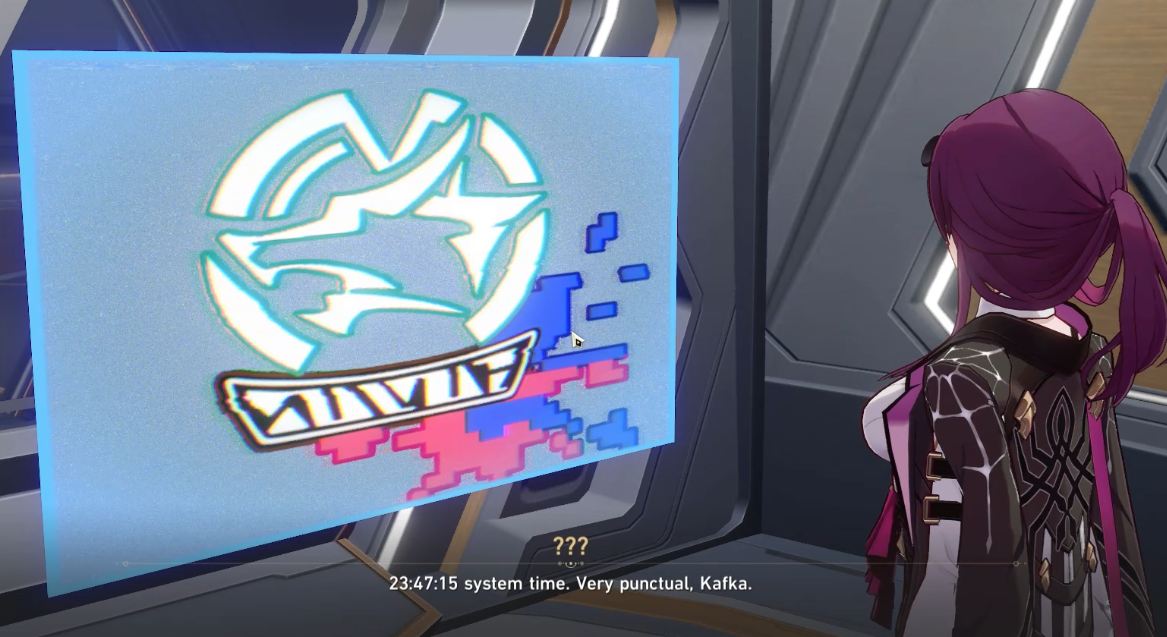 Но зато мы теперь знаем имя нашей героини — её зовут Кафка. «Системное время — 23:47:15. Очень пунктуально, Кафка» — говорит волчица с экрана. Elio always tells the exact future. So what's with the explosion just now? Was that also part of his script?