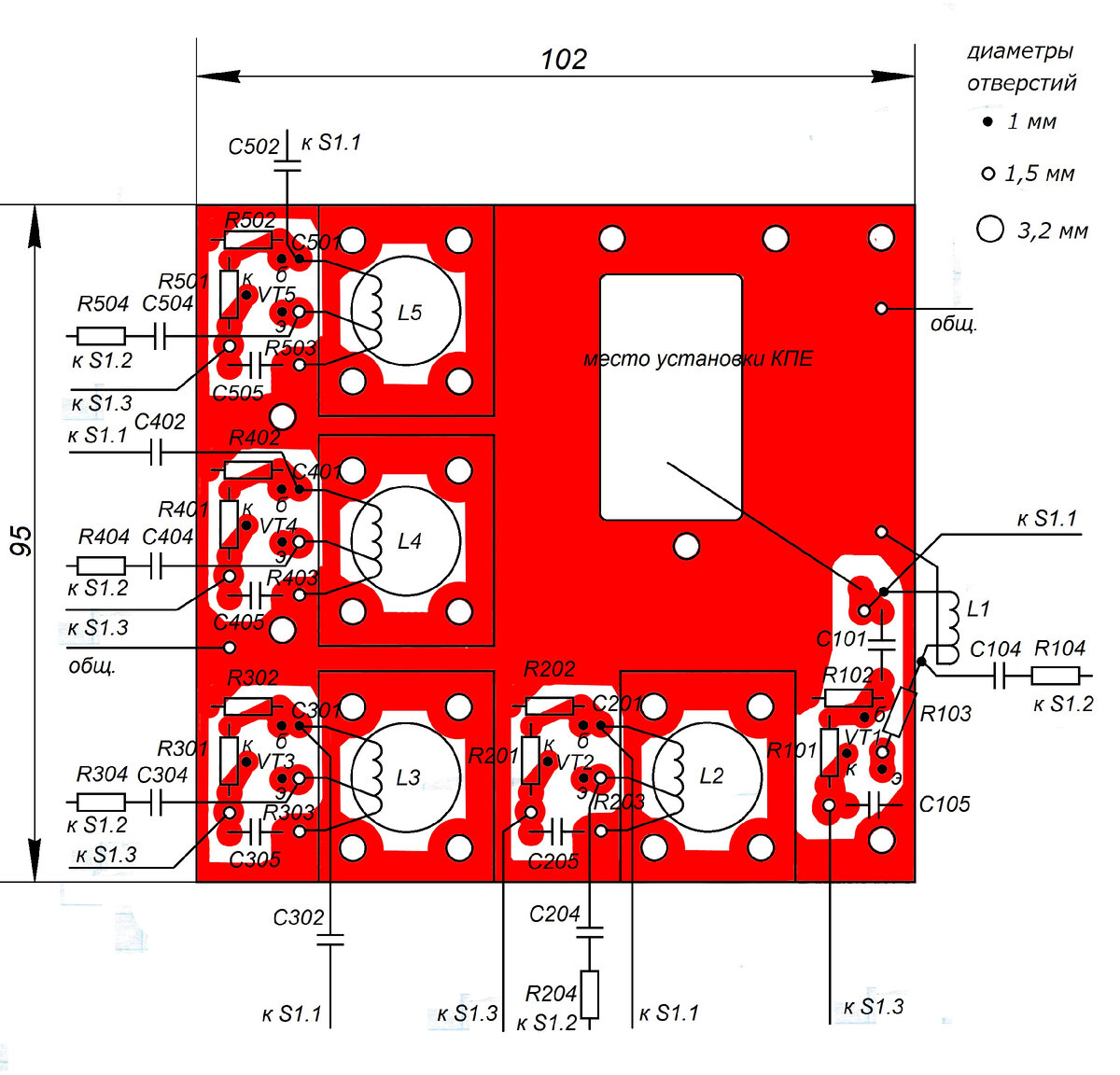 Проверьте расположение крепежных резьбовых отверстий на блоке КПЕ. Над платой должен располагаться не только его корпус, но и выходящие из него в положении минимальной емкости роторные пластины - хоть какая-то защита от повреждений. Блоки воздушных КПЕ имеют точки припайки секций также и снизу, поэтому в плате есть большой вырез под вырез в корпусе КПЕ. Туда под платой проходит проволочка от деталей генератора первого диапазона к секции С1а. Учтите, что у разных экземпляров пластины могут выходить в разные стороны от ручки. Если из нижней поверхности блока КПЕ торчат какие-то выступы, не дающие его ровно установить на плату - просверлите под них отверстия. Словом, здесь вам придется доработать чертеж под конкретный имеющийся у вас блок и только потом уже заняться изготовлением платы.