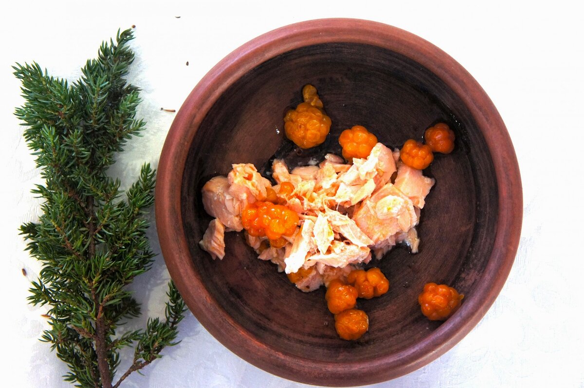 Саамский национальный салат из рыбы и морошки.