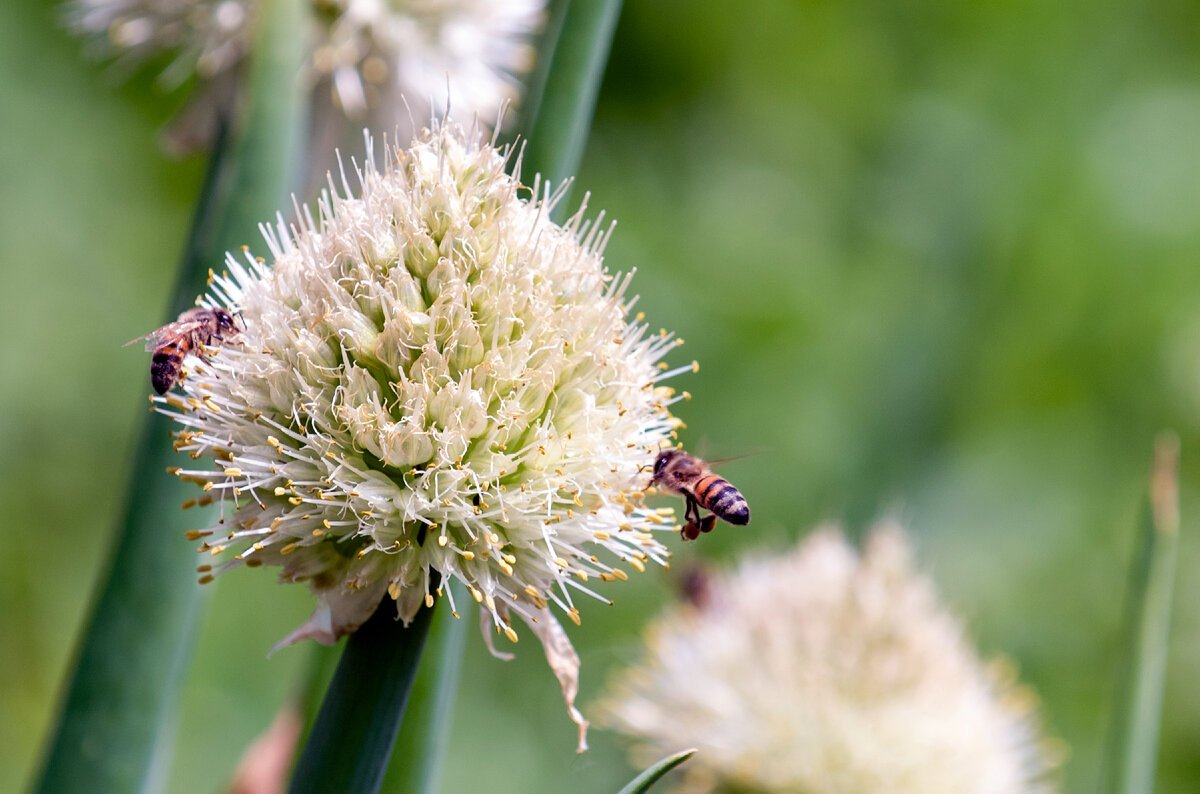 Хочу показать вам некоторые кадры пчел трудяг. В саду расцвел лук и привлекает своим цветением насекомых. Видите желтые комочки на задней паре ножек? Это пыльца, смешенная с нектаром. Называются они - обножки, и крепятся пыльцевой корзиночке, которая есть на ножках медоносной пчелы. Интересно, что средняя продуктивность лука по нектару - 115 кг с гектара, примерно 70 кг меда. Я и не знала, что это растение настолько медоносно. Изначально я планировала снимать пчелок на шиповнике, но они все предпочли лук. Всегда нравилось наблюдать за этими насекомыми. Спокойные трудяги, даже не обращают на меня внимание. Я не мешаю им, а они не трогают меня. Интересно и то, что если пчеле приходится жалить, то жало имея зазубрины отрывается вместе с частью брюшка и пчелка погибает. Вот такая небольшая статья с летними фото пчелок. Надеюсь вам понравилось. Спасибо, что дочитали! Не забывайте про лайки и комментарии, обратная связь сильно мотивируют меня на творчество. Подписывайтесь и не пропустите