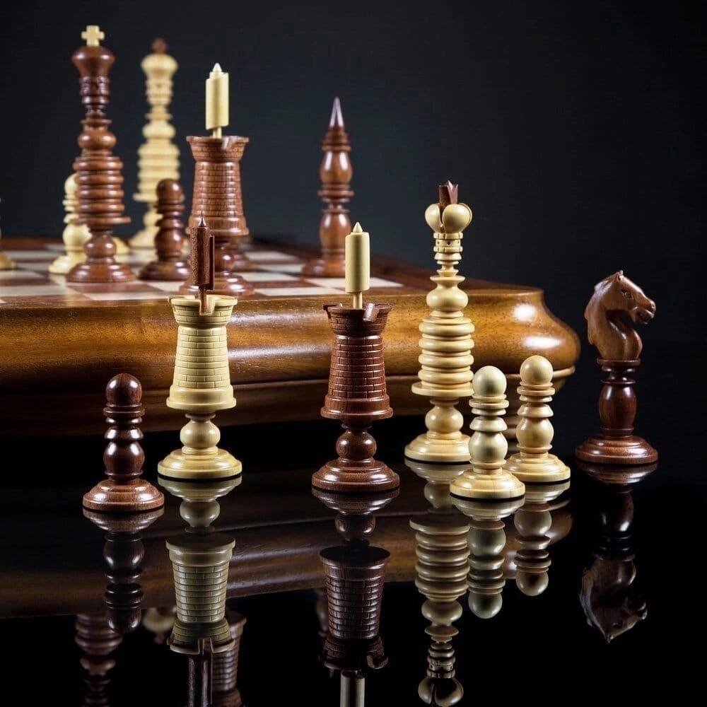 Барлейкорн – английский шахматный стиль середины XVIII века. Шахматы этой модели часто приобретались в подарок деловым партнерам и друзьям. Похожие шахматы в красно-белой гамме были подарены американскому президенту Томасу Джефферсону в 1785-1789 годах. Король имеет высокий головной убор. Они достигают в высоту 12,5 см и имеют абстрактную форму. Круговой узор, используемый для внешнего украшения фигур, напоминает ячменные зерна. Отсюда название серии – Барлейкорн. У слона, короля, ферзя и пешек имеются украшения, напоминающие популярные в то время гофрированные воротнички. Фигуры понятны даже новичкам. Каждая фигура расположена на небольшом округлом постаменте индивидуальной формы. Внутри подставок фигур находятся утяжеления. Низ подклеен бархатом для более мягкого скольжения по доске. Крупные размеры добавляют игре весомости, а набору – представительности. Это одна из причин, по которой шахматы барлейкорн быстро завоевали популярность в Европе. Форма шахматной доски авторская: изящная